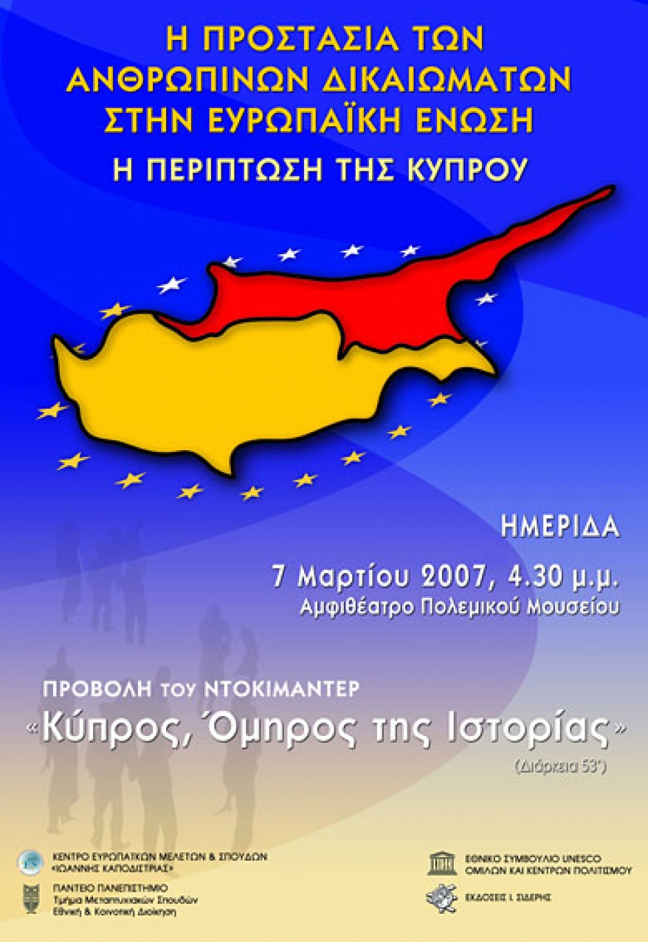 2007, Αθήνα , ημερίδα «Η Προστασία των Ανθρωπίνων Δικαιωμάτων στην Ευρωπαϊκή Ένωση. Η Περίπτωση της Κύπρου» στο Πολεμικό Μουσείο σε συνεργασία με την Κυπριακή Πρεσβεία στην Αθήνα και  το Παντειο Πανεπιστήμιο.